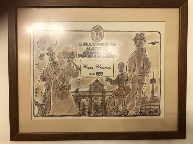 Valle-Inclán convirtió la taberna en la Cueva de Zaratustra, como recuerda una placa de mármol que figura en su fachada. Y el periodista Julio Camba, anarquista en su juventud, conservador en su madurez y genio en todo momento, creó una tertulia que aún pervive. El inolvidable académico y dibujante Antonio Mingote la presidió hasta su muerte y diseñó además el sello de la casa. Asiduos de Casa Ciriaco fueron igualmente los pintores Ignacio Zuloaga y Sebastián Miranda o los toreros Domingo Ortega y Juan Belmonte. Y, precisamente, como tributo a la tauromaquia todavía se celebra la tertulia Amigos del conde de Colombí. Pero la tasca ha acogido, además, a célebres abogados, actores, políticos y monarcas. Juan Carlos I, siendo Rey de España, y el entonces príncipe Felipe han disfrutado complacidos de su gastronomía.